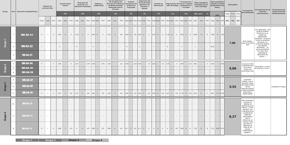 En la figura 1 se muestra la rúbrica aplicada para evaluar el desempeño en las exposiciones orales. En la figura 2 se muestran algunos resultados de la aplicación de esa rúbrica en instancias de auto, co y heteroevaluación, lo que una vez ponderado permite obtener el puntaje final en cada uno de los resultados de aprendizaje y la nota final correspondiente a cada grupo de estudiantes.