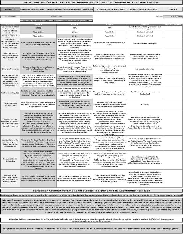 Consideramos que uno de los resultados concretos son las reflexiones de los estudiantes en las rúbricas de autoevaluación, colocamos algunas de ellas realizadas durante el ciclo 2023 en las asignaturas de Operaciones Unitarias y Operaciones Unitarias I. Sus testimonios son el reflejo del impacto favorable de esta propuesta.