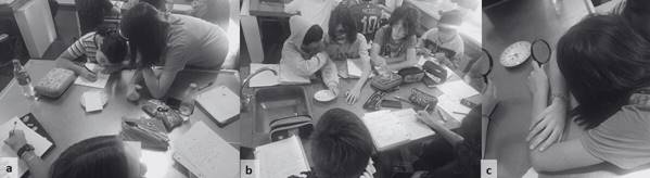 a) Registro del papel en su forma original; b) Observación del papel luego de cortarlo en trocitos; c) Observación de los cambios al quemar un trozo de papel.