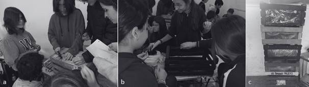 Figura 2: a) Estudiantes construyendo las composteras; b) Estudiantes pintando las composteras; c) Conjunto de composteras elaboradas por los grupos de un curso.