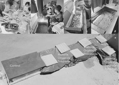 c) Compostera rellenada con materia orgánica triturada; d) Compostera rellenada con materia orgánica procesada con licuadora; e) Composición y disposición de las composteras en el patio de la escuela.